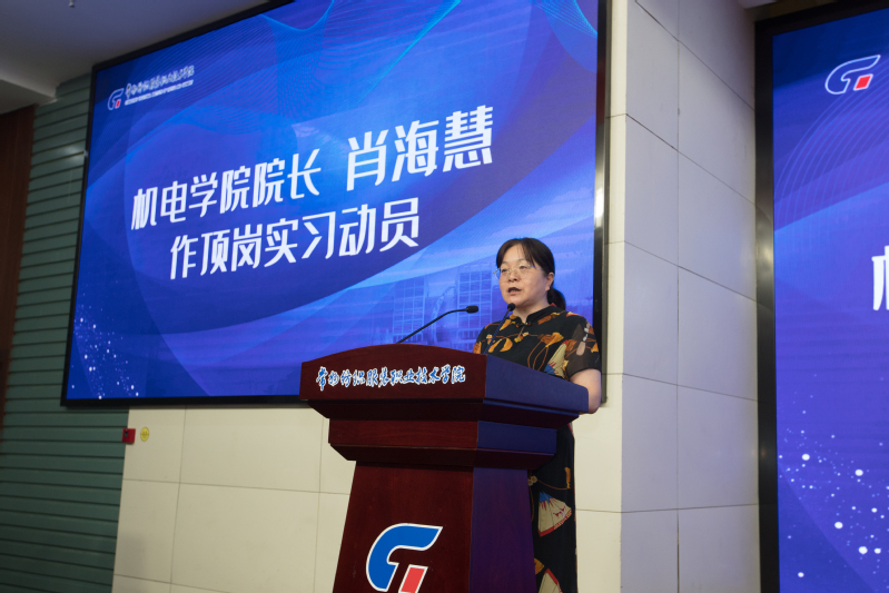 首先,机电学院院长肖海慧作顶岗实习动员,她指出同学们在踏上顶岗实习岗位的那一刻起,就是用知识武装自己,用技能提升自己,实现梦想的开始,希望同学们在实习岗位上,通过每天的辛勤工作,将所学专业技能与实际工作相结合的同时,切身体会社会对技能型人才的具体标准。希望同学们在顶岗实习工作中,学习有成绩、工作有收获,在人生职场的广阔舞台上,尽情书写华彩篇章!