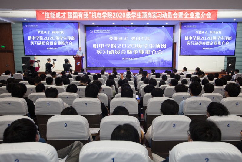 为调动学生投身于实习岗位的积极性,使学生充分认识通过实习积累实践经验的重要性和必要性,进一步增强实习信心,明确实习目标方向,机电学院于6月12日召开“技能成才·强国有我”——2020级学生顶岗实习动员会暨企业推介会、“送岗直通车”直播荐岗活动。学校党委书记吴访升,党委副书记、院长洪霄,党委副书记、纪委书记王顺明,党委委员、副院长张文明,学生工作处处长李洁琦,招生就业处处长董裕乾,教务处副处长许晓宇,科技处(校企合作处)副处长蒋云松,机电学院党政领导,专业负责人,教研室主任,2020级班主任,辅导员以及2020级全体学生参加了会议。会议由机电学院党总支书记严纲主持,会议分两阶段进行。