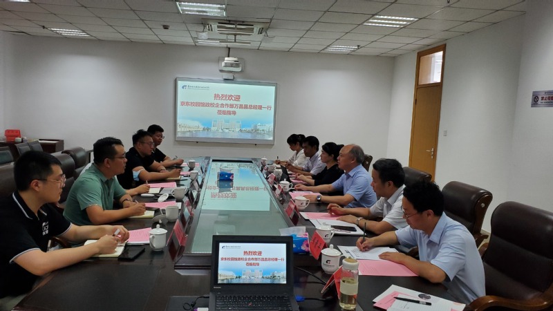 6月28日,京东集团政校企合作部总经理万昌昌、区域总经理许宏伟、王旺、区域经理孙宇辰、校园馆设计部经理董政一行来永利官网洽谈校企共建产教融合基地事宜。会前,首先由经贸学院院长余志军陪同京东集团万总一行参观了永利官网校史馆、文创展厅、创新创业基地、实训大楼等,并介绍了永利官网的发展历史与取得的成绩。随后,双方在1730会议室举行了校企深度合作洽谈会,永利官网党委书记吴访升、校企合作处处长李爱红、经贸学院院长余志军、经贸学院副院长杨永超、周贵平、创业学院谢燕月、经贸学院物流专业带头人陶正参加会议,会议由余志军主持。