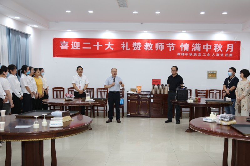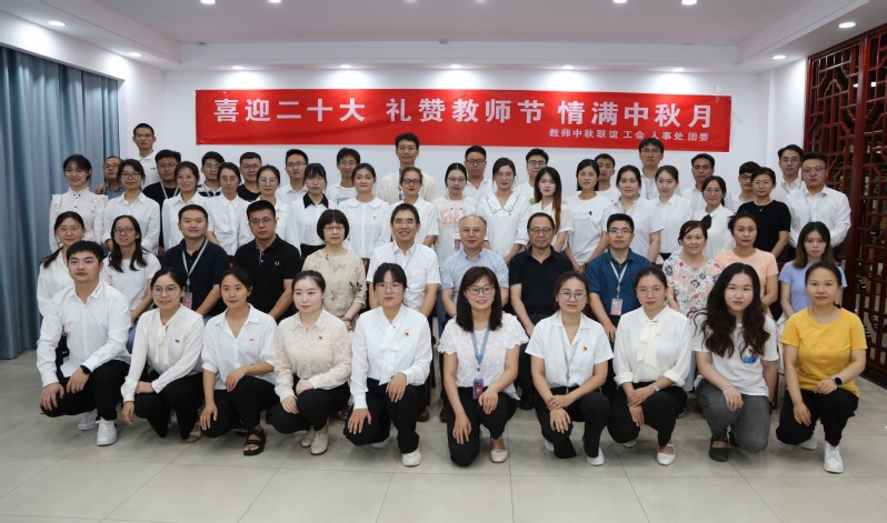 9月9日下午5:30,由校工会、人事处、团委联合举办的“喜迎二十大 礼赞教师节 情满中秋月”青年教师中秋联谊会在教工餐厅举行。校党委书记吴访升,党委委员、副院长邓凯、张震宇,党政办主任赵振勇,工会主席胡艳妹,人事处副处长侯喜军(主持工作),团委书记朱鹏以及四十余位新入职教师欢聚一堂,同迎教师节和中秋节。