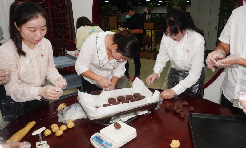 活动现场,老师们一起兴趣盎然的制作“常纺味道”专属月饼,捏饼皮,搓馅料,压模具,大家在欢声笑语中发挥团结互助精神,分享自己制作的方法和经验,场面热闹,气氛融洽。小小的月饼,承载着浓浓的情谊,包裹着浓浓的祝福。老师们在尽情享受快乐的同时,更感受到一份浓浓“常纺大家庭”的温暖。