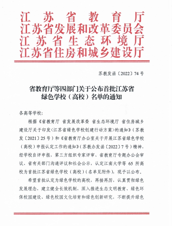 根据《省教育厅、省发展改革委、省生态环境厅、省住房城乡建设厅关于印发<江苏省绿色学校创建行动方案>的通知》(苏教发[2021] 25号)和《省教育厅办公室关于开展江苏省绿色学校(高校)申报认定工作的通知》(苏教办发函[2022]7号)精神,经学校自评申报、第三方组织专家评审、省教育厅专题办公会审议、省有关部门沟通评议和社会公示,永利官网被评为首批“江苏省绿色学校(高校)”。