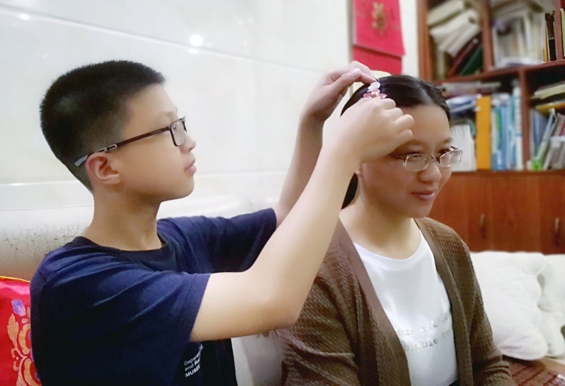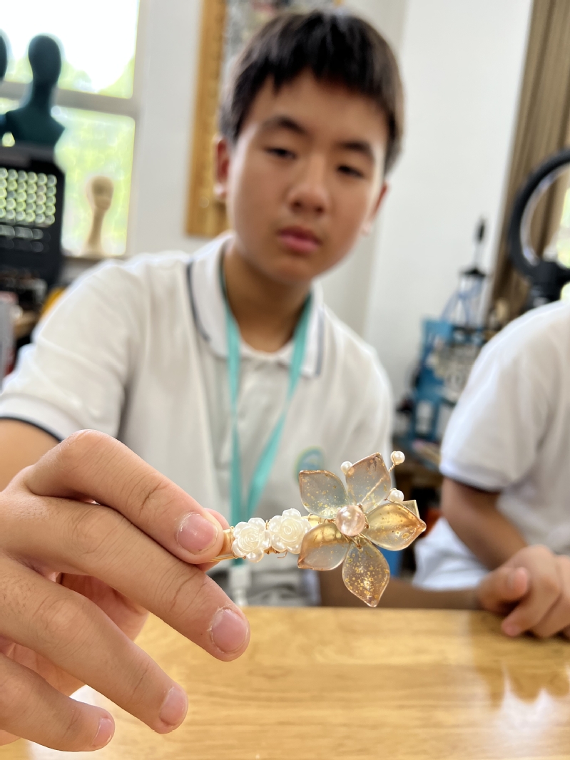 下午的实践体验是:“献给妈妈的礼物”——发饰制作。周生力和许东春两位老师精心准备,生动讲解,细心指导。周生力老师从发饰的发展文化导入主题,简述了各朝代的发饰特征及制作要领;许东春老师演示了各种发饰装点的技巧。两位老师都做了现场示范。在场师生,认真聆听,十分投入。师生们在实践中,充满热情,按照两位老师的讲解和示范,很快进入状态。期间,两位老师一直在查看并帮助同学们进行合理的设计并全程指导。师生们经过近两小时的努力,一件件精美的“礼物”闪亮的呈现了出来,大家都很兴奋的观摩并交流了彼此的作品和制作心得。同学们的本次发饰手工作品,虽然稚嫩了点,但妈妈们收到如此珍贵的礼物,感动不已。