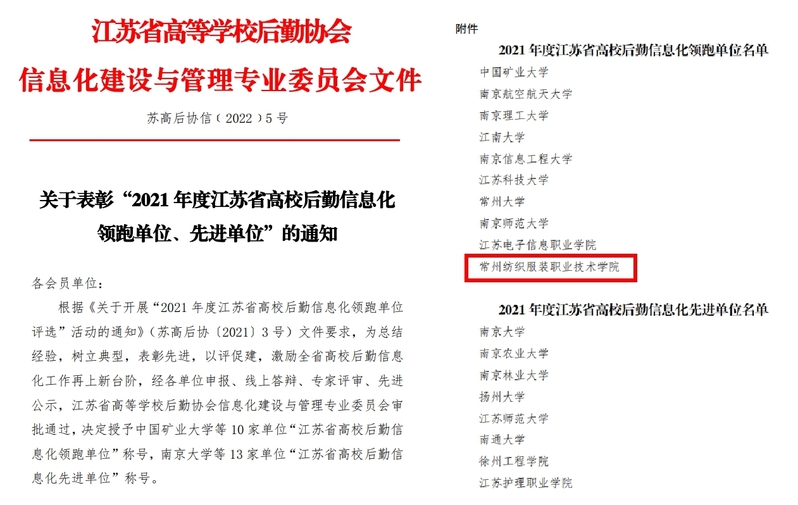 根据《关于开展“2021年度江苏省高校后勤信息化领跑单位评选”活动的通知》(苏高后协〔2021〕3号)文件要求,经各单位申报、线上答辩、专家评审、先进公示,江苏省高等学校后勤协会信息化建设与管理专业委员会审批通过,永利官网获得2021年度“江苏省高校后勤信息化领跑单位”称号。今后,永利官网将以此为契机,不断推动后勤信息化建设再上新台阶。 文:潘璐 审核:管俊洛