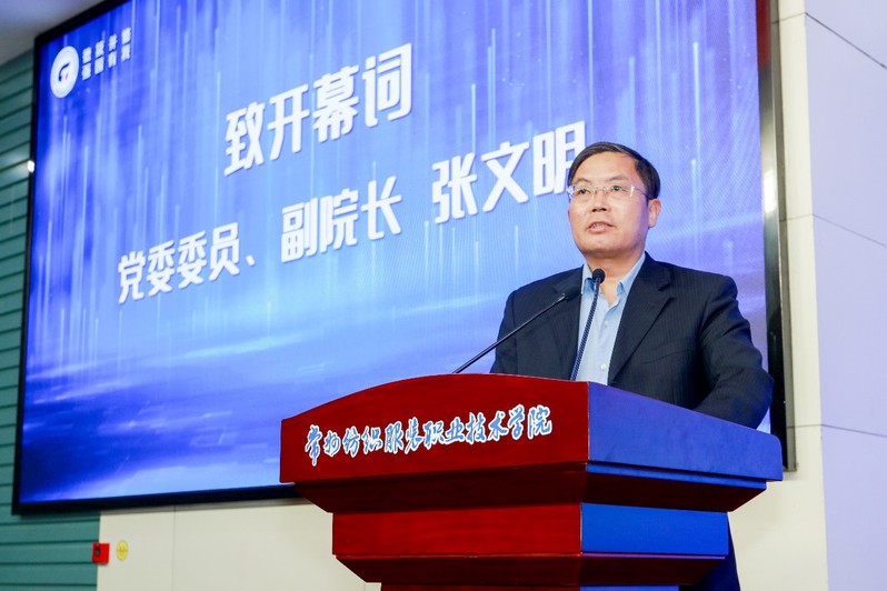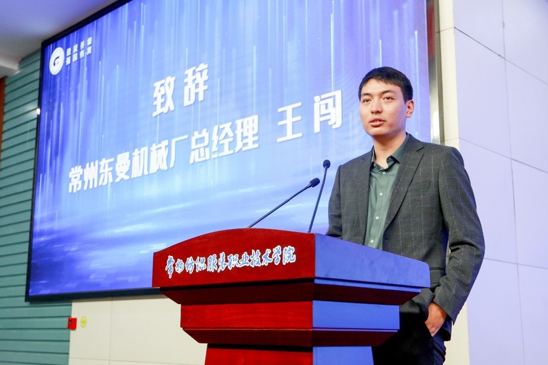 随后,常州东曼精密机械厂总经理王闯致辞。2021年,机电学院与东曼成立了纺院—东曼实训基地。王闯以”常纺人”这张名牌为傲,希望东曼与常纺院机电学院进一步更新人才观念,制定人才目标,调整工作思路,实现协同育人和三全育人,努力让同学们在实践过程中建立科学的知识体系。