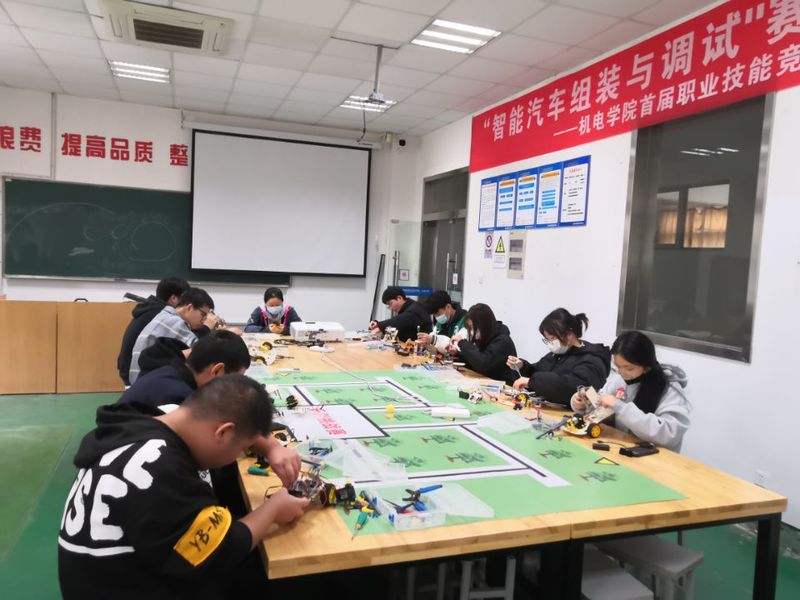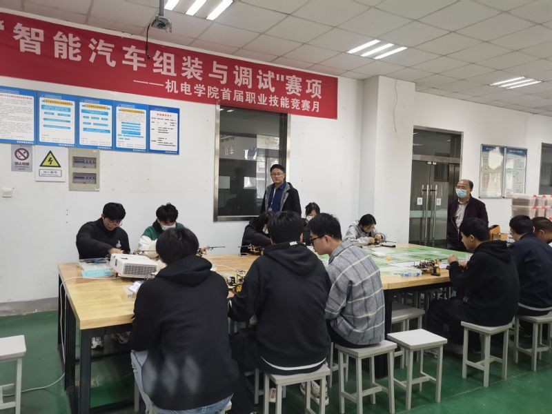 11月23日初赛胜出选手参加决赛。比赛要求参赛选手在规定时间内,对智能化小车进行安装与调试;依据规范完成作业流程,并根据现场裁判的要求完成试车,要能熟练地查阅维修资料、设置参数、规范使用工量具和仪器设备、准确设置技术参数,做到安全文明作业。