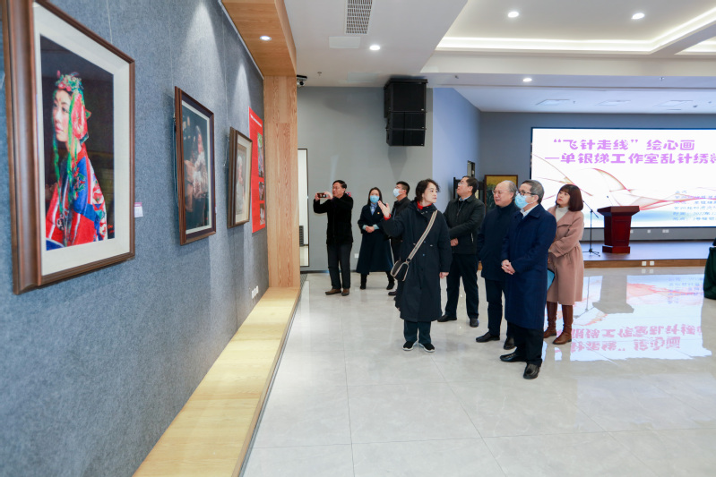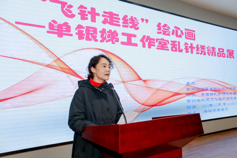 12月2日下午,“飞针走线”绘心画---单银娣工作室乱针绣精品展在永利官网领秀展厅举行。单银娣工作室负责人、单银娣女儿黄莉,单银娣工作室艺术指导张振宇,常州市非物质文化遗产促进会会长黄欣,中国纺织服装教育学会会长倪阳生,光大银行武进支行行长陆明,南京云开数据科技有限公司焦艾琳,学院党委书记吴访升,党委委员、副院长张文明,党委委员、宣传部长夏斌,党政办主任赵振勇,人事处长侯喜军,教务处长夏冬,科技处、校企合作处长李爱红,团委书记朱鹏,学生处副处长陆亚波,以及各二级学院院长出席开幕式。开幕式由文化传承与创新中心主任顾明智主持。