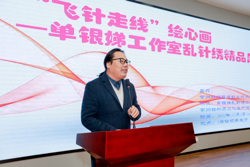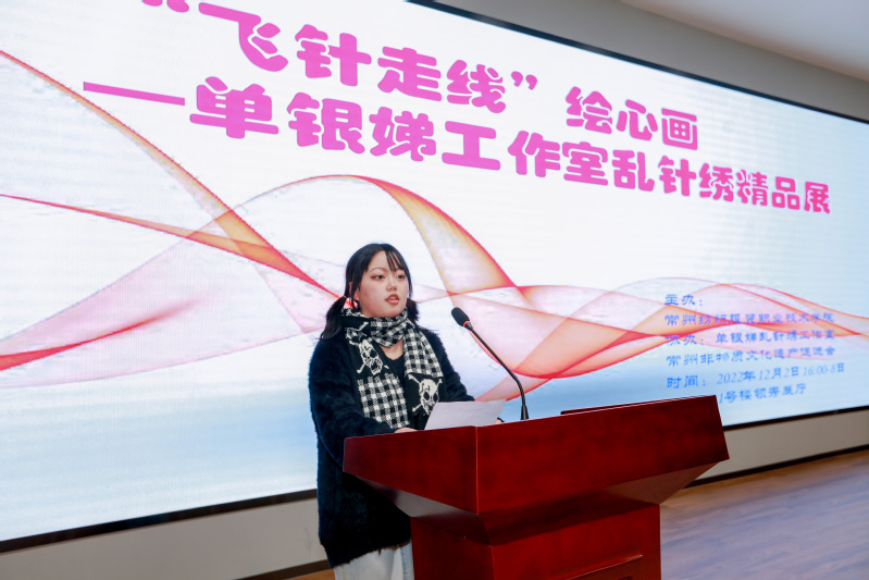 服设2232班吴杰表示,很荣幸能参加今天的开幕式并在此发言,单银娣大师,黄莉老师和张振宇老师的作品是作为常州乱针绣创始人杨守玉先生第三代、第四代传承人,作品琳琅满目、色彩斑斓、技艺精湛,非常值得我们观摩、学习、传承、发扬。