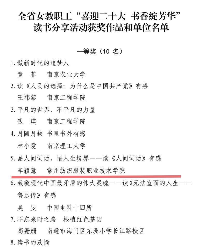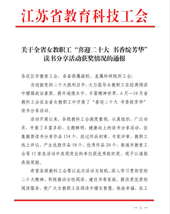 为迎接党的二十大胜利召开,大力倡导女教职工在经典阅读中增强政治素质、提升道德水平、丰富精神世界,积极营造爱读书、读好书、善读书的浓厚氛围。江苏省教育科技工会在全省女教职工中开展了“喜迎二十大 书香绽芳华” 读书分享活动,本次活动从6 月—10 月,在全省征集推荐读书分享作品 154 个。经过作品初审、专家评审、教职工线上评议,产生优胜作品 50 个、优秀作品 20 个。永利官网车颖慧老师的作品“品人间词话,悟人生境界——读《人间词话>》有感”在本次读书分享活动中经过层层评审,荣获一等奖。