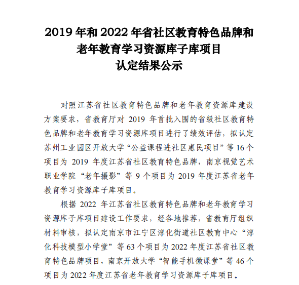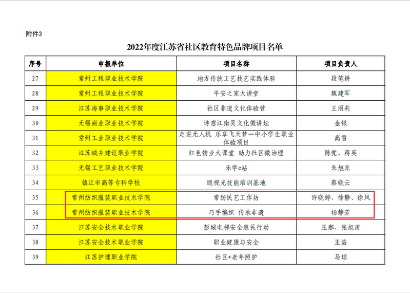 根据《省教育厅关于公布2019年和2022年省社区教育特色品牌和老年教育学习资源库子库项目认定结果的通知》(苏教继函〔2022〕1号),我院申报的《常纺民艺工作坊》、《巧手编制 传承非遗》获得江苏省社区教育特色品牌项目。本次入选江苏省社区教育特色品牌项目共63项,其中入选2项的江苏高职院校有8所。