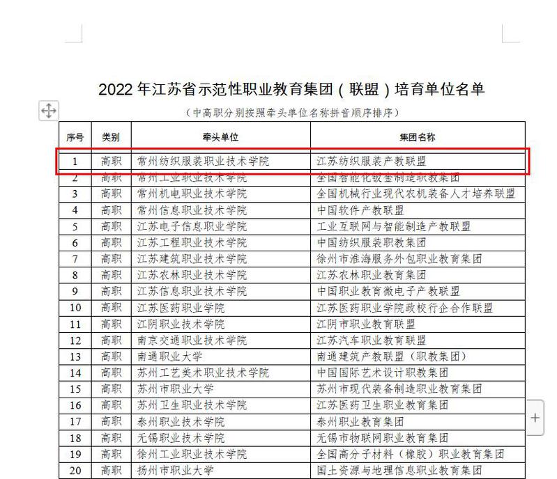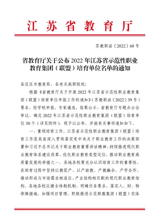2022年12月29日,江苏省教育厅正式发文(苏教职函〔2022〕68号),公布了 2022 年江苏省示范性职业教育集团(联盟)培育单位名单。永利官网牵头成立的江苏纺织服装产教联盟被立项为省示范性职业教育集团(联盟)培育单位。此次申报工作,校领导高度重视,由校企合作处牵头,教务处、招就处、学工处、创业学院、继续教育学院、国际学院等职能部门及各二级学院通力配合,大家共同协作完成申报, 最终经省专家评审,成功获得江苏职业教育集团培育单位资格。