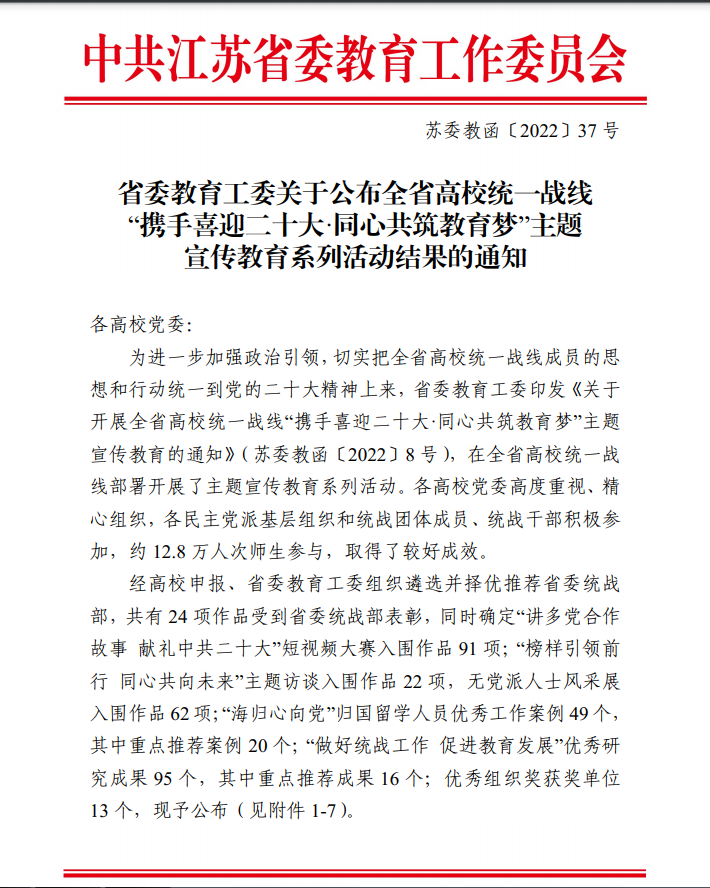 近日,江苏省委教育工委公布了全省高校统一战线“携手喜迎二十大•同心共筑教育梦”主题宣传教育系列活动结果(苏委教函〔2022〕37 号),永利官网选送的4项作品全部获奖:《同心同向 共识共为 献礼二十大》荣获“讲多党合作故事 献礼中共二十大”短视频大赛优秀奖;《初心不改潜育人 一世傲骨丹青情》荣获“榜样引领前行 同心共向未来”无党派人士风采展优秀奖;《秉持初心 肩负使命 奋勇前进》荣获“海归心向党”归国留学人员优秀工作案例;研究论文《高校党外知识分子统战工作探究》荣获“做好统战工作 促进教育发展”优秀研究成果奖。