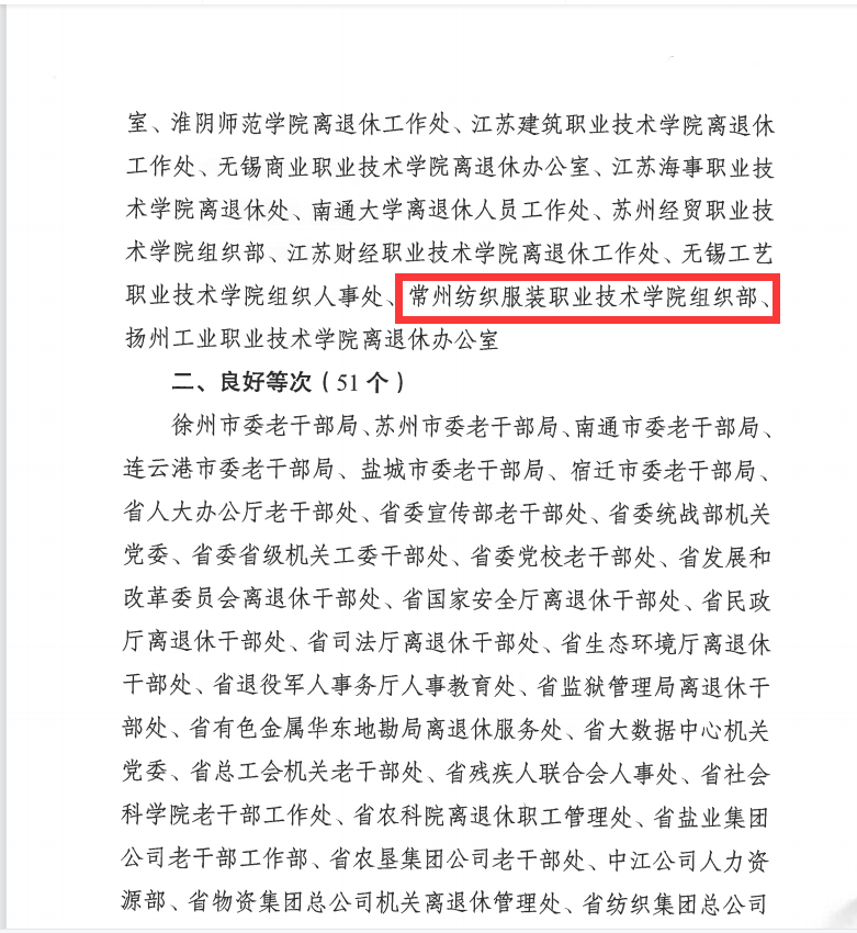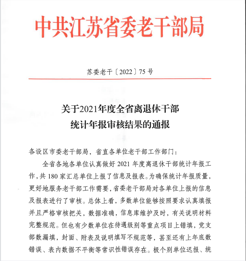近日,江苏省委老干部局公布《关于2021年度全省离退休干部统计年报审核结果的通报》,永利官网组织部荣获2021年度全省离退休干部统计年报工作优秀单位。全省仅8所高职院校荣获优秀。