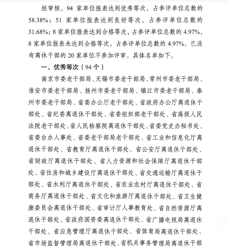 据悉,全省共180家设区市委老干部局和省直单位老干部工作部门上报了2021年度离退休干部信息统计年报,经审核,经审核,94家单位报表达到优秀等次,占参评单位总数的58.38%;51家单位报表达到良好等次,占参评单位总数的31.68%;8家单位报表达到合格等次,占参评单位总数的4.97%,8家单位报表未达到合格等次,占参评单位总数的4.97%。