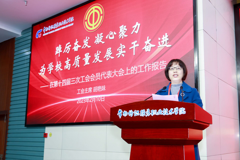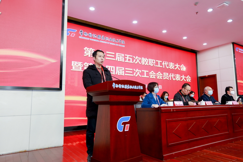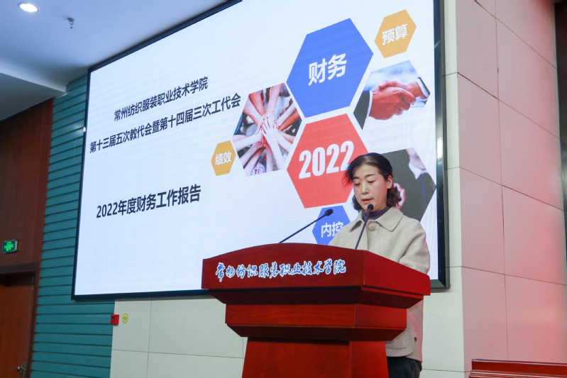 党委副书记、院长洪霄首先向大会作了题为《坚定信心启新程 勇担大任谱新篇 为建设中国纺织服装高职强校接续奋斗》的工作报告。报告从“党的建设工作质量取得全面提高、人才自主培养质量取得全面攀升、三教改革促进教学质量得到全面加强、高水平师资队伍建设得到全面加快、产教融合协同育人得到全面深化、科技创新和社会服务实现全面突破、内部质量保障体系得到全面构建、高质量合作交流办学得到全面推进、统筹疫情防控和安全发展得到全面巩固、学校美誉度和影响力得到全面提升” 十个方面,全面回顾了学校2022年工作。