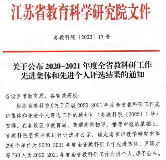 2022年6月12日,江苏省教育科学研究院发布了《关于公布2020-2021年度全省教科研工作先进集体和先进个人评选结果的通知》,永利官网获评“教科研工作先进集体”。