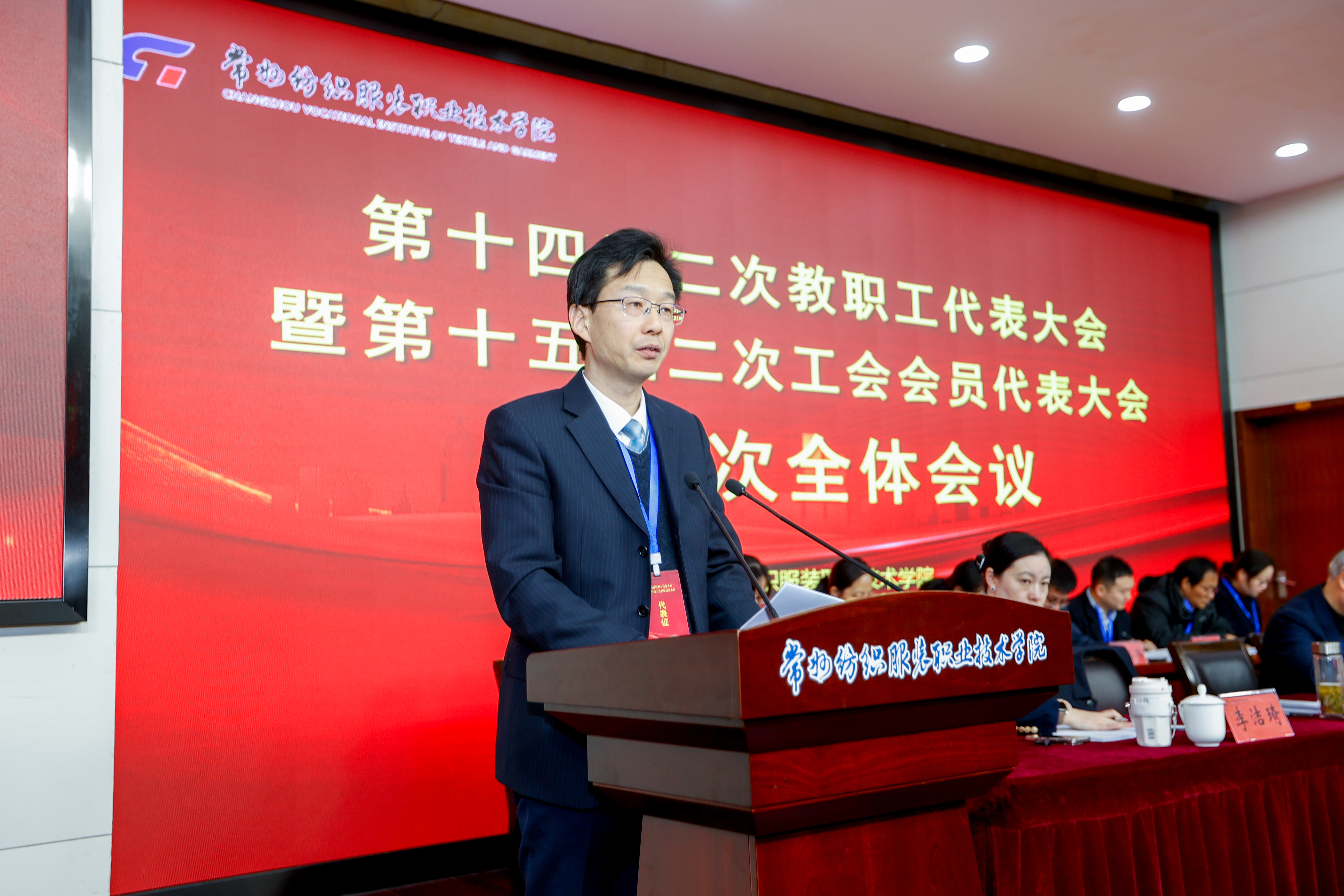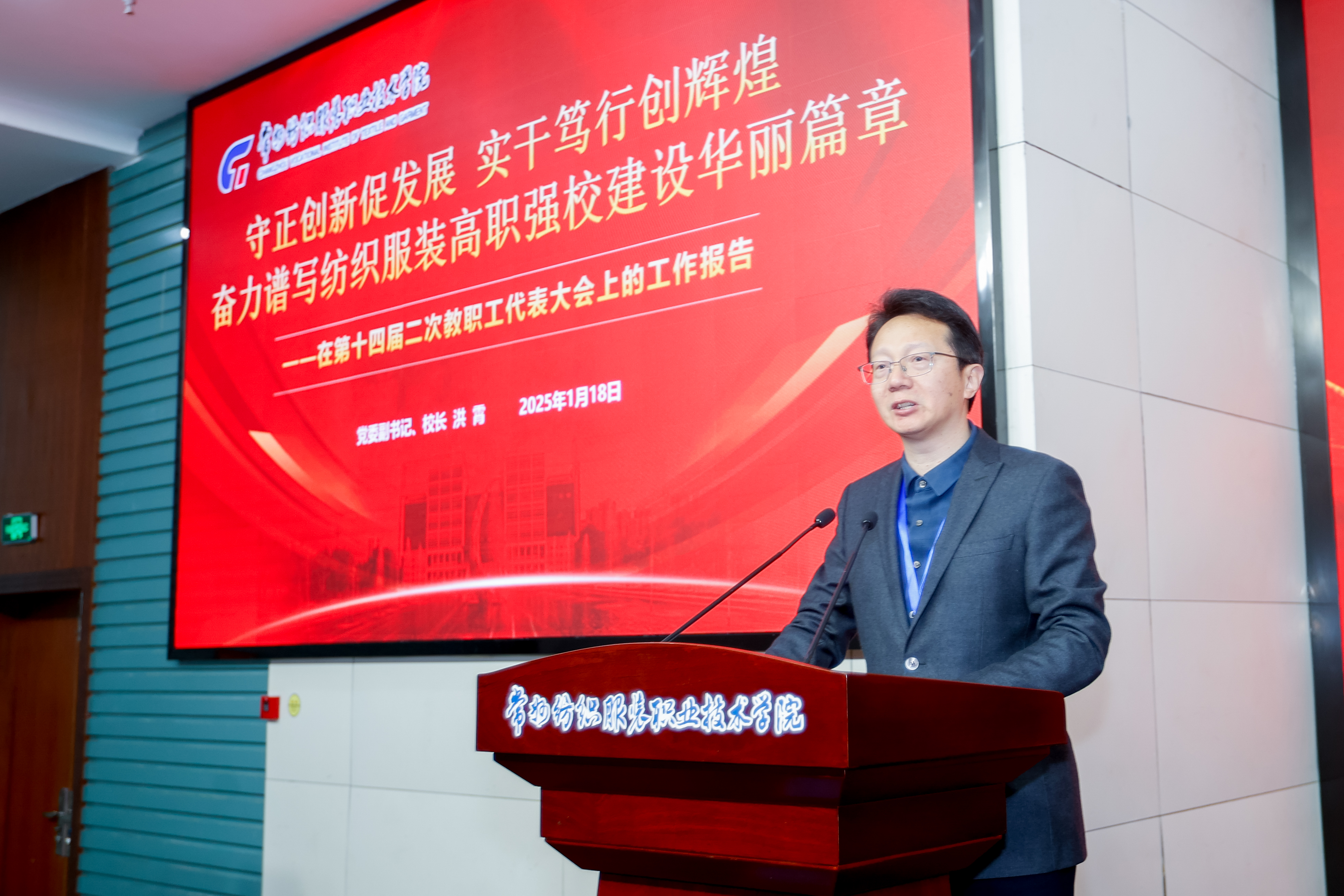 党委副书记、院长洪霄首先向大会作题为《守正创新促发展、实干笃行创辉煌,奋力谱写纺织服装高职强校建设华丽篇章》的工作报告。洪霄用强化党建引领、强化以人为本、强化专业建设、强化产教融合、强化创新驱动、强化人才支撑、强化开放办学、强化依法治校、强化安全意识等九个强化对2024年学校的事业发展作了全面回顾和总结。