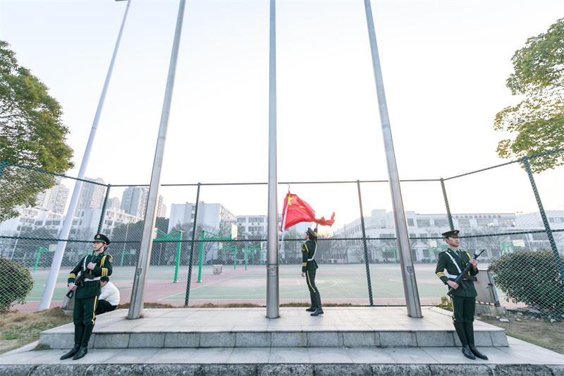 上午7时,升国旗仪式正式开始。国旗护卫队迈着整齐划一的步伐,在铿锵有力的脚步声中护卫着五星红旗入场。伴着庄严嘹亮的国歌声,旗手振臂一挥,鲜艳的五星红旗徐徐展开。在师生的庄严注视中,五星红旗缓缓升起,在熠熠晨光中迎风飘扬。