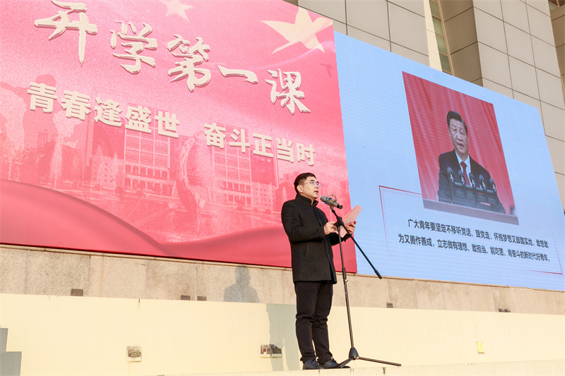 最后,张震宇以“青春逢盛世,奋斗正当时”为题,为同学们上一堂精彩的思政课。他回顾了过去一年永利官网在教育教学管理中取得的喜人成果,同时向同学们提出新学期的三点希望和要求:一要深学细悟二十大精神,入脑入心,厚植爱党爱国爱社会主义的家国情怀;二要牢记总书记的嘱托,感恩奋进,以常纺作为人生新起点,努力成长为更好的自己,见证并携手共创民族伟业;三要躬身中国特色社会主义,知行合一,努力把自己锻炼成为有理想、敢担当、能吃苦、肯奋斗的新时代好青年。