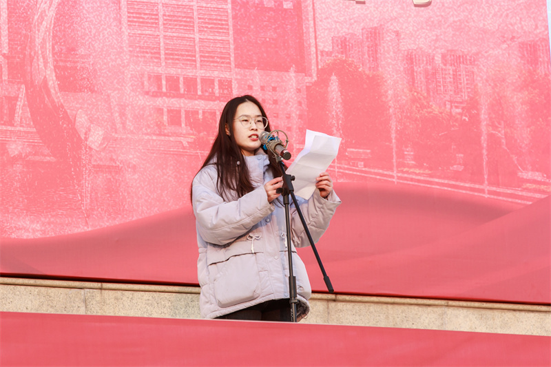 人文学院幼服213E班徐雨佳同学作为学生代表做国旗下讲话,她号召同学们发扬奋斗和拼搏精神,不断突破和超越自我,脚踏实地、不骄不躁,以实际行动谱写热血青春,因为奋斗的青春最美丽!