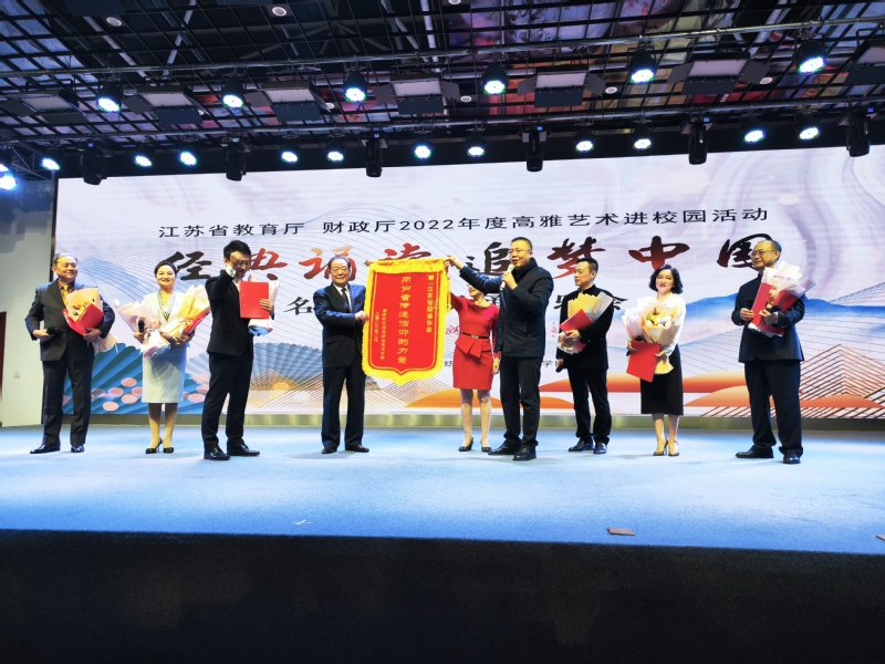 本场音乐会汇聚了江苏朗诵界最具代表性的表演艺术家,节目呈现由江苏演艺界资深导演精心策划编排,共分为《见字如面》《信仰之光》《春天的思念》《相信未来》《追梦中国》五个篇章。他们用饱含深情的声音演绎了一段段惊心动魄、可歌可泣的历史瞬间。声声入耳,丝丝入扣,全场观众都沉浸在这场声音的盛宴中。整场朗诵会结构紧凑,朗诵作品随篇章主题层层递进、丝丝入扣,表演者高超的艺术呈现使得现场掌声不断。从苦难到辉煌的百年党史,从站起来、富起来到强起来的国家历程,1个多小时的朗诵打开了一幅幅波澜壮阔的历史画卷。演出结束,学生代表上台为演员献花,夏斌代表学校为江苏省朗诵协会授予锦旗。