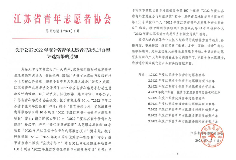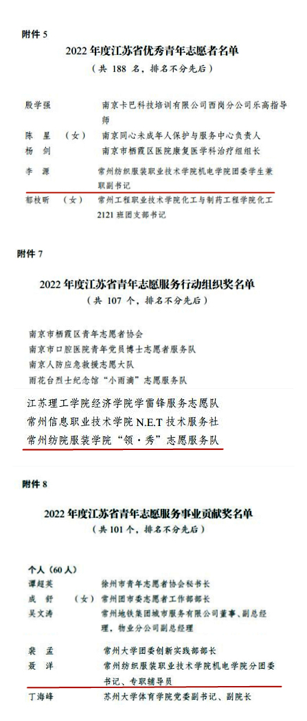 近日,在由共青团江苏省委、江苏省青年志愿者协会联合举办的2022年度全省青年志愿者行动评选表彰中,机电学院机器人2131李源获评江苏省优秀青年志愿者,机电学院聂洋老师获评江苏省青年志愿服务事业贡献奖,服装学院“领·秀”志愿服务队获评江苏省青年志愿服务行动组织奖。
