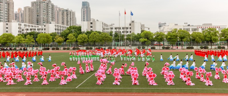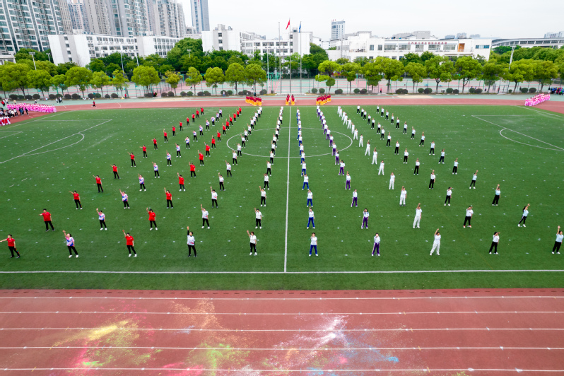 运动员、裁判员代表宣誓后进行了团体操表演。手捧鲜艳花球的学生啦啦操队脚踏动感节拍,焕发出激扬的青春风采,拉开了团体操表演的帷幕;由各分工会组成的教工团体一改以往肃立讲台、伏案工作的面貌,用一曲《最好的舞台》以广场舞的方式尽情绽放教工风采;450名学生身着绚丽服装,手持花球、舞蹈扇、彩旗不断变换队形演绎出《同心共筑中国梦》的美好场景,团体操表演惊艳了全场,将开幕式表演氛围推向高潮。