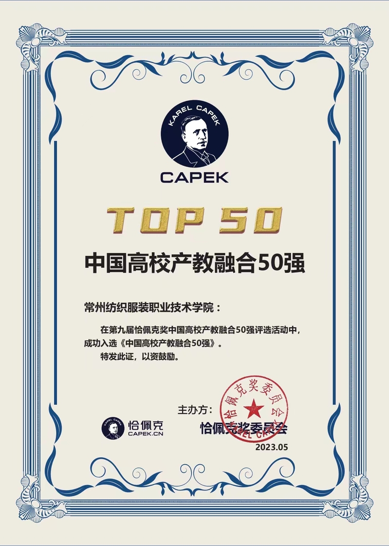 第九届恰佩克颁奖典礼中国高校产教融合50强奖状