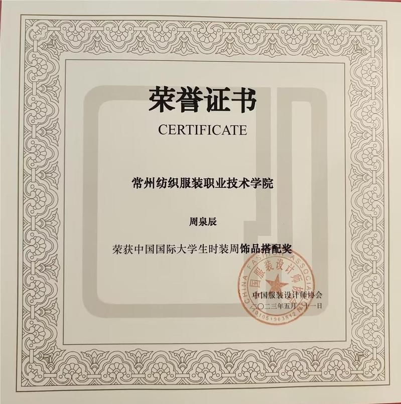 周泉辰获中国国际大学生时装周饰品搭配奖