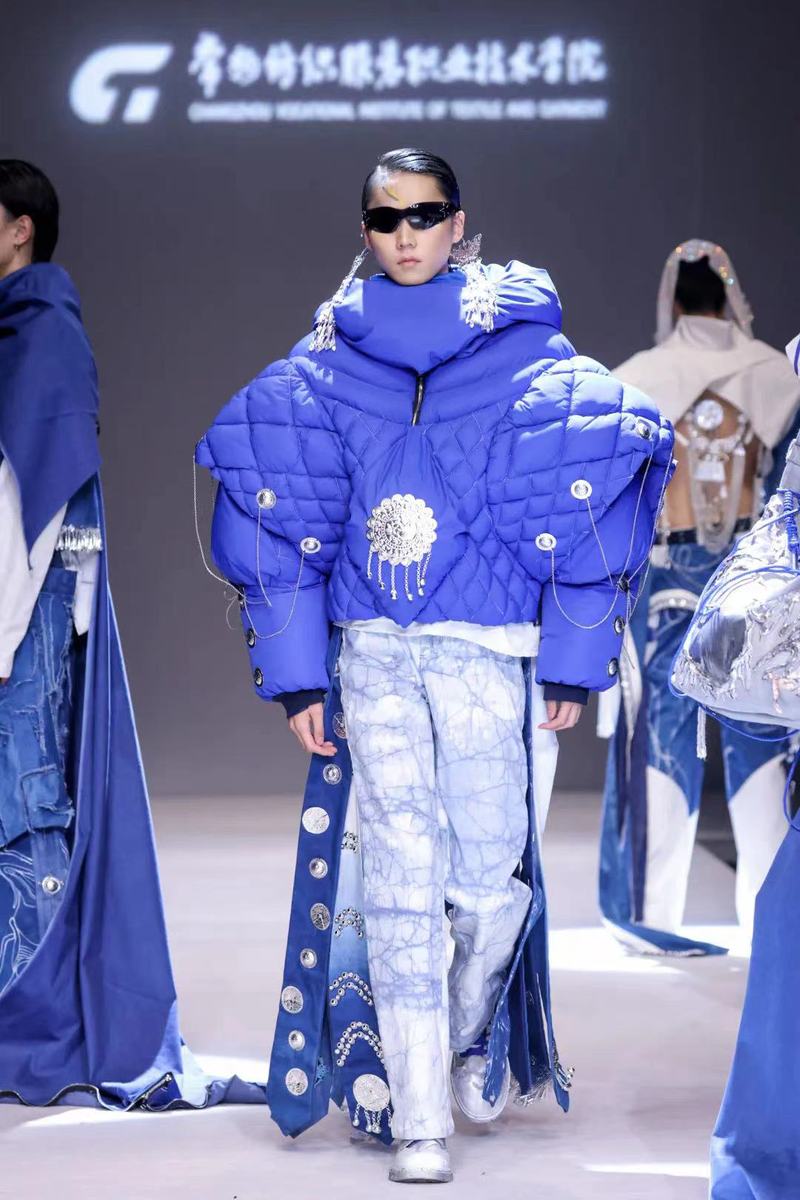 追趋逐耆——街潮与苗族传统银饰、纹样、图腾元素相结合,采用大胆的配色与戏剧性的轮廓造型,将传统民族元素与当代审美相结合,表达着当代青年对非遗文化的传承和创新。