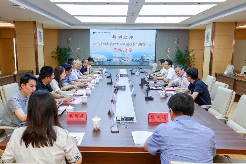2023年6月1日下午,江苏农牧科技职业学院党委委员、副校长刘俊栋一行来校调研交流。党委副书记、院长洪霄,教务处处长夏冬,信息中心主任王一凡、副主任薛鹏飞等在1646会议室接待了来宾,会议由洪霄主持。