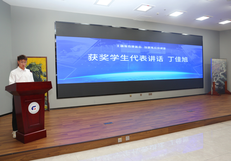 会议伊始周妍代表创意学院全体师生致欢迎辞,李方联介绍了学院技能大赛月开展情况。据介绍,2023年创意学院在江苏省职业院校技能大赛中参加了5个赛项,取得了3个二等奖,2个三等奖。今年技能大赛月活动,创意学院党政班子高度重视,全面发动,精心组织,做到初赛全员全覆盖,形成“强技重艺”的学院氛围,并通过复赛拔苗子,挑种子,为来年的技能大赛建梯队,组团队。学院层面的学生技能大赛中共产生一等奖25人,二等奖39人,三等奖81人,并组建了2024年技能大赛师生团队,希望能在明年的各项技能大赛中有所突破,取得好成绩。许晓宇宣读了省赛、院赛技能大赛获奖名单,陆亚波为获奖学生颁奖,随后学生代表丁佳旭和教师代表武传奇介绍了参加大赛的心得体会和感悟。