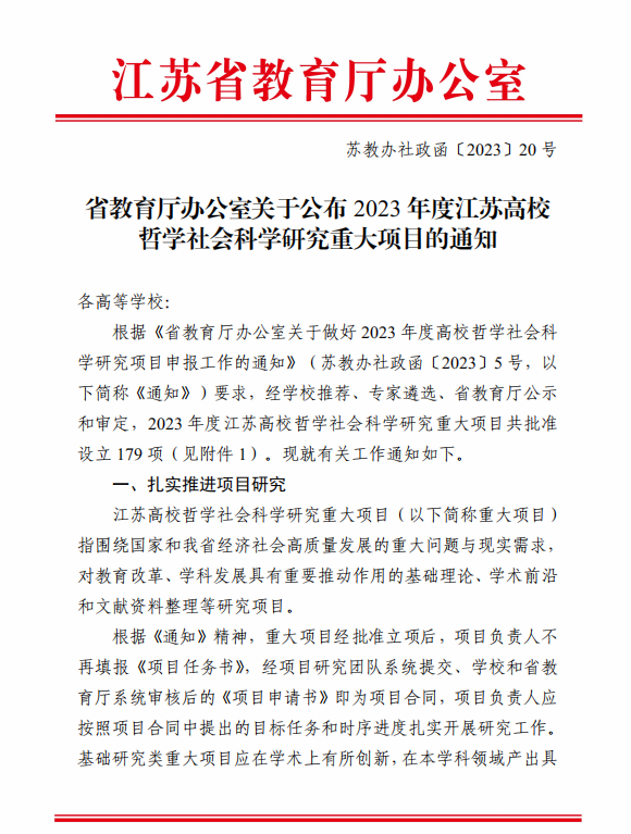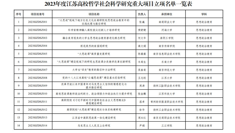 根据江苏省教育厅《省教育厅办公室关于公布2023年度江苏高校哲学社会科学研究重大项目的通知》(苏教办社政函〔2023〕20 号)文件,永利官网马克思主义学院屈卓老师主持的《高职院校<习近平新时代中国特色社会主义思想概论>课程建设研究 》获批思政重大项目。永利官网高度重视各级各类重大项目的培育工作,加大对立项课题的政策支持,加强有组织科研,督促项目负责人按期保质保量完成研究任务,大力培养一批优秀的高层次人才。(图文:科技处 审核:李爱红) (公布文件)