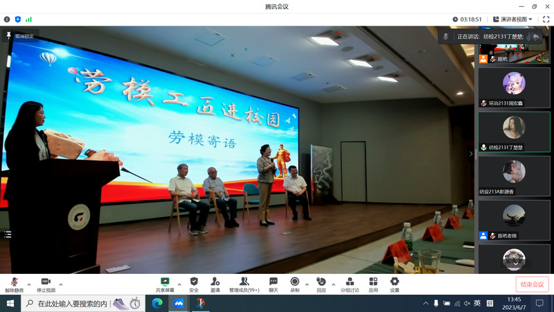 专场宣讲会邀请了全国劳模、原常州市纺织工业局局长吕振远主讲,通过线上线下方式,同步向纺织学院全体师生直播。吕局长首先分享了与永利官网的渊源,他是永利官网的筹建者之一,也是永利官网的兼职教师和校友,然后结合自身成长经历,从加强大学生爱党爱国教育、加强技能实践培养和纺织工业发展等方面对学校和师生提出希望。通过吕局长的宣讲,全体师生增强了对“爱岗敬业、争创一流、艰苦奋斗、勇于创新、淡泊名利、甘于奉献”的劳模精神以及“执着专注、精益求精、一丝不苟、追求真理”的工匠精神的深刻理解。