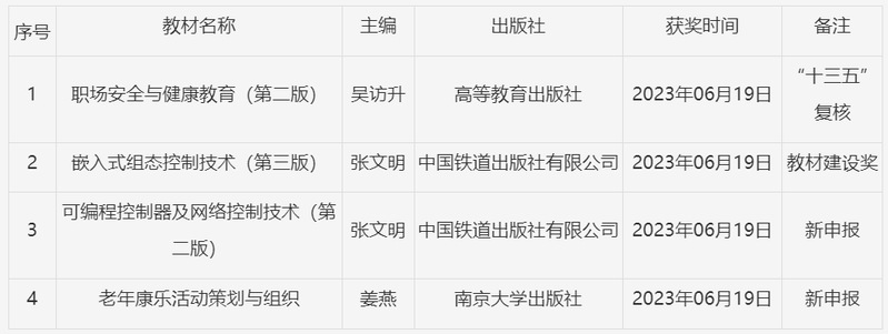 根据《教育部办公厅关于公布首批“十四五”职业教育国家规划教材书目的通知》(教职成厅函〔2023〕19号)文件通知,共确定首批“十四五”职业教育国家规划教材入选7251种(其中“十三五”复核教材3567种、“十四五”新申报教材3326种、首届教材建设奖314种和立项建设中职公共基础课44种),永利官网新增入选“十四五”职业教育国家规划教材共有4种,包括“十三五”复核入选1种,新申报入选2种,首届全国优秀教材建设奖获奖教材入选1种,详细信息如下: