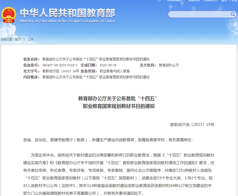 教育部公布首批“十四五”职业教育国家规划教材书目的通知