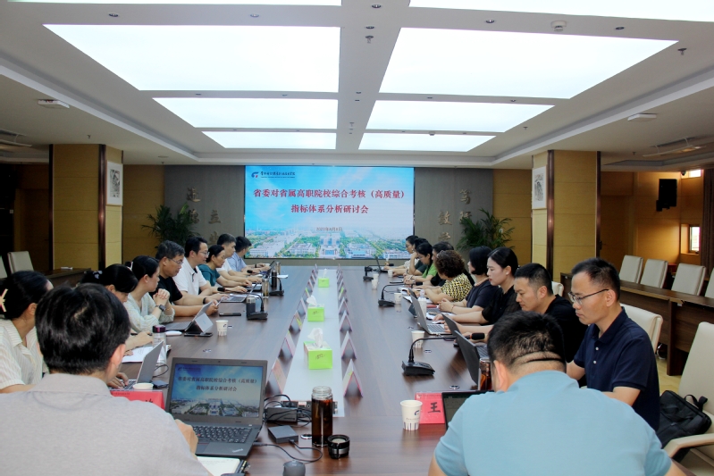 为做好2023年度省委对学校综合考核(高质量发展)指标任务的落实,推进学校高质量发展,8月8日下午,党委副书记、院长洪霄组织召开了省委对省属高职院校综合考核(高质量)指标体系分析研讨会。党委委员、副院长赵玲珍、张文明、张震宇出席会议,相关职能处室负责人参加了会议。