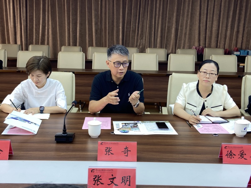 张文明首先对丽水职业技术学院一行的到访表示热烈欢迎,并简单介绍了学校的发展情况;肖海慧、李方联、袁红萍分别介绍了机电、创意、服装学院的专业建设、师资队伍建设、产教融合、校企合作、技能大赛等方面的情况。