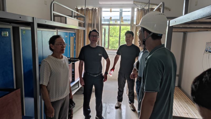 8月14日上午,党委副书记、院长洪霄,党委委员、副院长赵玲珍一行视察学校暑期建设项目,后勤保障部直属党支部书记管俊洛、副部长陈东升、蒋艳及相关项目负责人陪同。洪霄、赵玲珍对五号楼、九号楼公共教室木门更换及屋面防水修缮项目,美食城、西点餐厅装修项目,二食堂后场电梯改造项目,35栋学生宿舍床铺更新项目等施工现场进行了巡视,各项目负责人对项目实施进展情况、预计完成时间等进行了详细介绍。