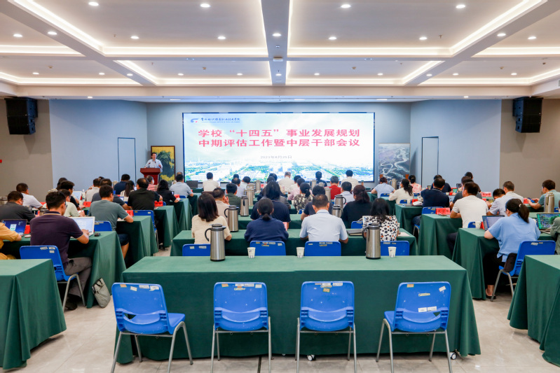 2023年8月25日上午,学校在领秀展厅召开“十四五”事业发展规划中期评估工作暨中层干部会议,全体中层及以上干部参加了会议。会议由党委副书记、院长洪霄主持。