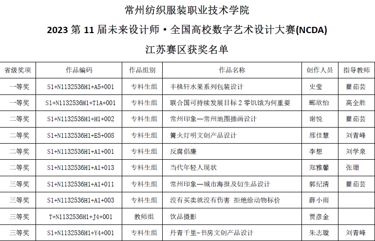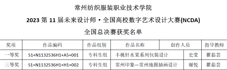近日,由工业和信息化部人才交流中心主办的第十一届未来设计师·全国高校数字艺术设计大赛(NCDA)获奖名单公布,创意学院师生作品在1826所参赛高校的近29万件作品中脱颖而出,共获国赛奖项2项,其中,获得一等奖1项、三等奖1项;另外在省级赛中,获得一等奖2项,二等奖4项,三等奖4项。