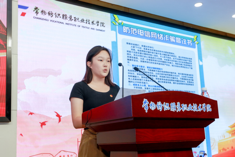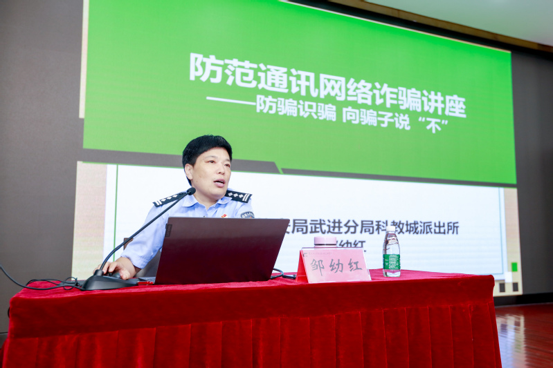 启动仪式结束后,市公安局武进分局科教城派出所副所长邹幼红向与会学生代表开讲开学反诈第一课。