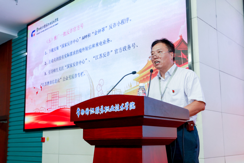 启动仪式上,罗卫东向与会师生详细介绍了永利官网本次“校园防范电信网络诈骗犯罪宣传周”的任务目标、宣传内容和工作安排。校青协反诈志愿者周绮妙作为校园反诈志愿者代表,向全校学生发出了预防校园防范电信网络诈骗犯罪的倡议。党委委员、副院长张震宇对本次活动提出工作要求并宣布宣传周正式启动,他指出:一直以来,学校高度重视电信网络安全工作,不断增强广大师生的防骗意识,将校内电信网络诈骗“零案件”作为工作的奋斗目标,学校各相关职能部门和二级学院要以本次活动为契机,进一步提高思想认识、明确工作职责,强化工作创新,紧扣宣传重点,落实工作措施,确保反诈宣传无死角,切实维护广大师生切身利益,提升师生在校学习和生活的幸福感,努力创建“江苏省高质量平安校园”和“无诈校园”。