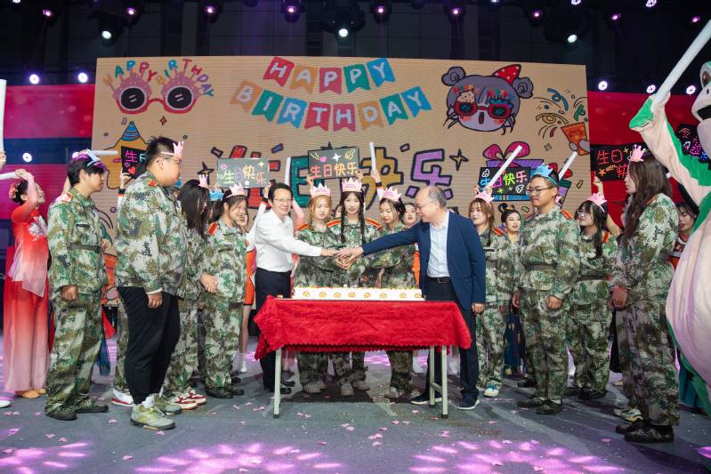 当迎新晚会渐入高潮,舞台上演了温馨一幕:吴访升书记和洪霄院长代表学校为当天过生日的16名新生送上生日祝福。