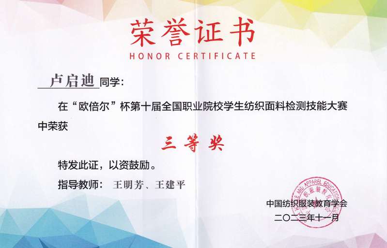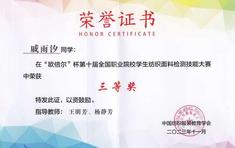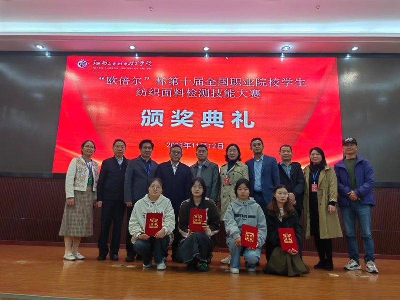 2023年11月10-12日,由中国纺织服装教育学会主办的“欧倍尔”杯第十届全国职业院校学生纺织面料检测技能大赛在江西工业职业技术学院举行,来自全国20所职业院校73名参赛选手参加了本次比赛。经过两天的激烈角逐,顺利完成了全部比赛项目。永利官网纺织学院王明芳、王建平、杨静芳老师指导的4名参赛选手在比赛中沉着冷静,充分发挥了应有的训练水平,并荣获佳绩。其中纺检2231班王凤文获得一等奖,封晶晶获得二等奖,卢启迪、戚雨汐获得三等奖。