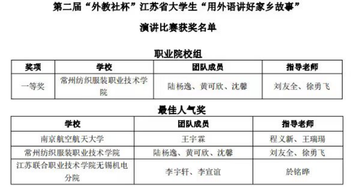 第二届“外教社杯”江苏省大学生“用外语讲好家乡故事”演讲比赛决赛于11月23日在常熟理工学院东湖校区举行。本次比赛全省共有近200支团队参加,经过初赛选拔,本科组共有45支、职业院校组共有71支团队入围决赛。永利官网商英223本陆杨逸团队成功入围决赛,在决赛中荣获一等奖,并获评最佳人气奖。