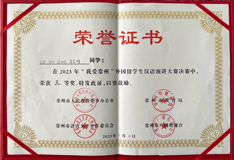 12月12日,由常州市人民政府外事办公室、常州市语言文字工作委员会、常州市教育局、常州广播电视台共同主办的2023年“我爱常州”外国留学生汉语演讲大赛总决赛在河海大学落下帷幕。经过全市9个高校赛区和1个中学赛区的初赛选拔,共有来自印度尼西亚、俄罗斯、塔吉克斯坦、科特迪瓦、刚果(金)、瑞士、奥地利等12个国家的18名大中学校的外国留学生选手晋级总决赛。经过激烈角逐,永利官网马来西亚籍留学生李芷晴代表学校参赛并获得决赛三等奖,yl6809永利官网获优秀组织单位奖。