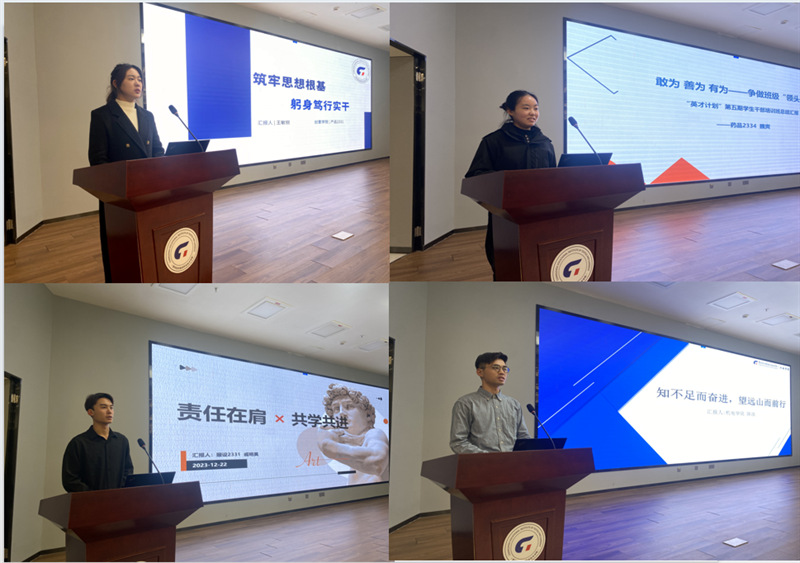 各二级学院班长代表从培训学习感受、学生干部的角色定位和班级建设的设想汇报了培训成果。创意学院王敏锐同学认为学生干部要用真情聚人、用品格感人、用作风带人、用能力服人。纺织学院魏爽同学表示,“不想当元帅的士兵,不是好士兵;先相信自己,别人才会相信你。学生干部要敢为、善为、有为。”服装学院戚明昊同学强调“执行力、自制力和领导力是学生干部不可或缺的能力。”机电学院陈浩同学表示“靠谱”的学生干部要做到“四勤”,即腿勤、嘴勤、手勤、脑勤,凡事有交代,件件有着落,事事有回音。经贸学院张袁韬从实施民主管理、倡导合作与竞争、鼓励创新思维、促进学风养成四个方面介绍了班级管理的思路。人文学院吴芯宇同学认为学生干部要有理想、有目标、有规划,并向大家分享了个人和班级的三年规划。