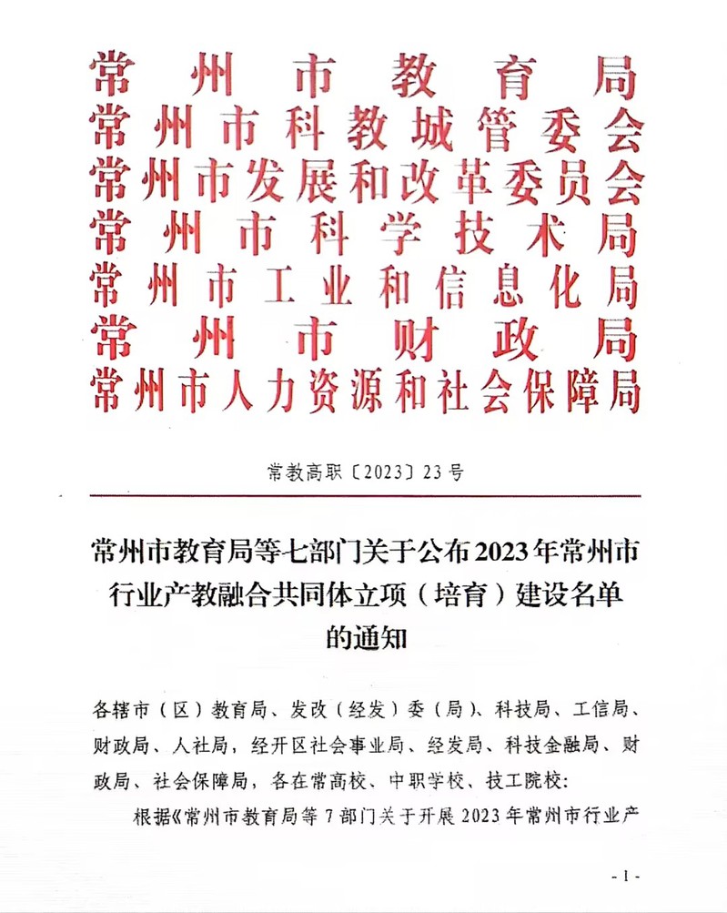 永利官网获批2023年常州市行业产教融合共同体立项