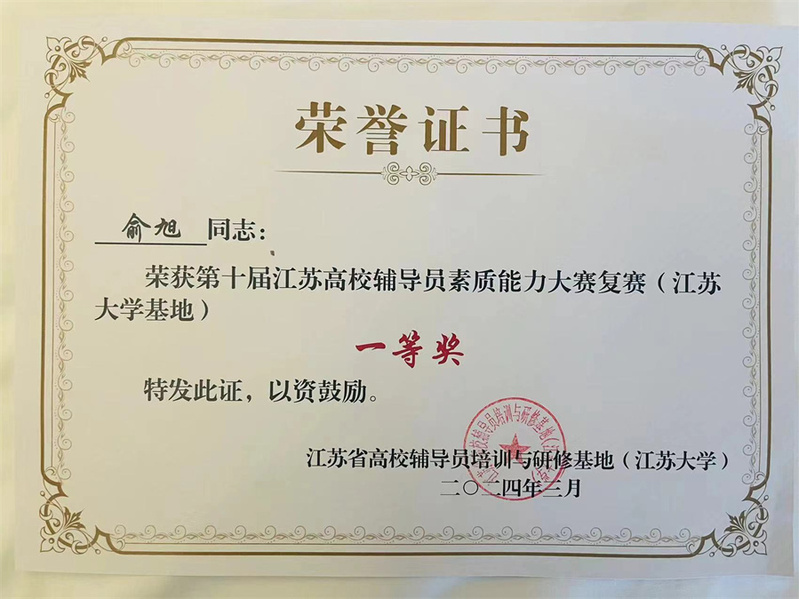 3月27日—28日,由江苏省委教育工委、江苏省教育厅主办,江苏省高等教育学会辅导员工作研究委员会、江苏省高校辅导员培训与研修基地(江苏大学)协办的第十届江苏高校辅导员素质能力大赛复赛圆满落幕。来自镇江、常州、无锡三个地区高职高专院校的20名辅导员同台竞技,经过激烈角逐,永利官网人文与健康学院辅导员俞旭以第2名成绩斩获一等奖,成功晋级省赛决赛,取得永利官网辅导员在该项赛事中的历史最好成绩。